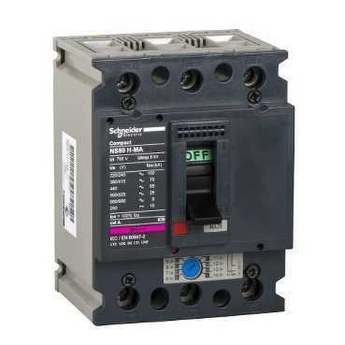 Interruptor automático Compact NS80H, MA, 12,5A, 3p3R. Gama de producto: NS80H-MA - tipo de producto o componente: interruptor automático - nombre corto del dispositivo: Compact NS80H - nombre del interruptor automático: Compact NS80H - aplicación de dispositivo: motor - descripción de polos protegidos: 3t - tipo de red: CA - frecuencia de red: 50/60 Hz - código de poder de corte: H - poder de corte: 10 kA en 600 V CA 50/60 Hz de acuerdo con NEMA AB1, 100 kA Icu en 220/240 V CA 50/60 Hz de acuerdo con IEC 60947-2, 25 kA Icu en 500 V CA 50/60 Hz de acuerdo con IEC 60947-2, 25 kA Icu en 525 V CA 50/60 Hz de acuerdo con IEC 60947-2, 6 kA Icu en 660/690 V CA 50/60 Hz de acuerdo con IEC 60947-2, 65 kA Icu en 440 V CA 50/60 Hz de acuerdo con IEC 60947-2, 70 kA Icu en 380/415 V CA 50/60 Hz de acuerdo con IEC 60947-2, en 240 V CA 50/60 Hz de acuerdo con NEMA AB1, en 480 V CA 50/60 Hz de acuerdo con NEMA AB1 - [Ics] poder de corte en servicio: Ics 100 kA 220/240 V CA 50/60 Hz de acuerdo con IEC 60947-2, Ics 25 kA 500 V CA 50/60 Hz de acuerdo con IEC 60947-2, Ics 25 kA 525 V CA 50/60 Hz de acuerdo con IEC 60947-2, Ics 6 kA 660/690 V CA 50/60 Hz de acuerdo con IEC 60947-2, Ics 65 kA 440 V CA 50/60 Hz de acuerdo con IEC 60947-2, Ics 70 kA 380/415 V CA 50/60 Hz de acuerdo con IEC 60947-2 - categoría de empleo: categoría A - unidad de control: MA - tipo de protección: protección contra cortocircuitos (magnética). Aplicaciones: de 0,37 kW a 37 kW....